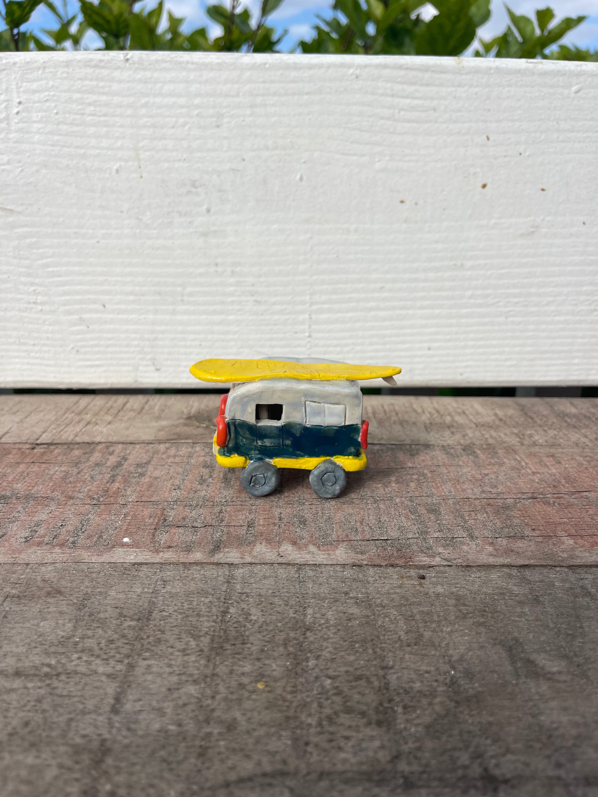 Beautiful and Unique mini beach van with surfboard handcrafted in Hermosa Beach by Masa Ceramics