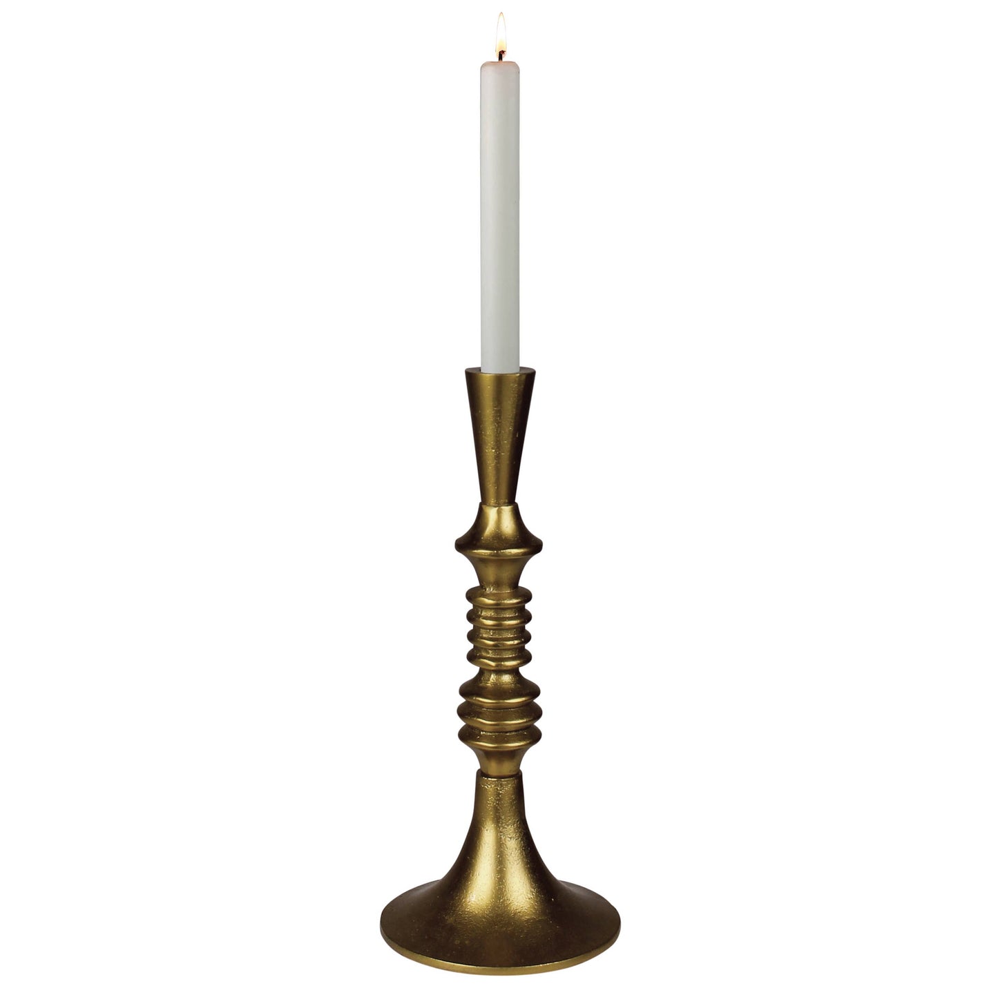 This tall, ornate taper holder sets the mood for an evening and casts a warm, flickering glow on whatever is being served up. Brass plated aluminum.